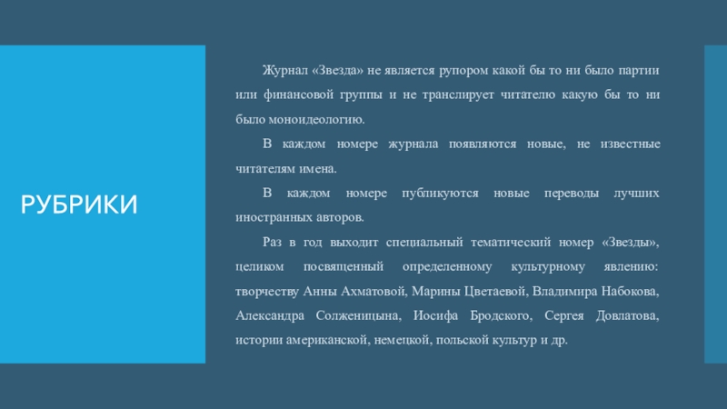 РУБРИКИЖурнал «Звезда» не является рупором какой бы то ни было партии или финансовой группы и не транслирует