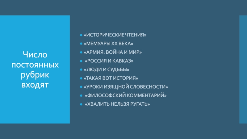 Число постоянных рубрик входят«ИСТОРИЧЕСКИЕ ЧТЕНИЯ»«МЕМУАРЫ ХХ ВЕКА»«АРМИЯ: ВОЙНА И МИР» «РОССИЯ И КАВКАЗ»«ЛЮДИ И СУДЬБЫ»«ТАКАЯ ВОТ ИСТОРИЯ»«УРОКИ