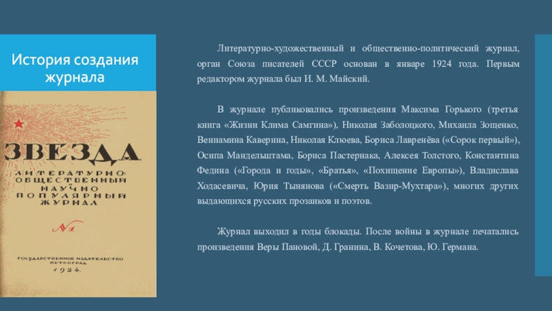 История создания журнала  Литературно-художественный и общественно-политический журнал, орган Союза писателей СССР основан в январе 1924 года.