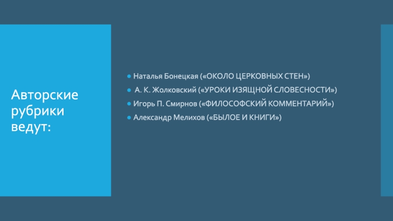 Авторские рубрики ведут: Наталья Бонецкая («ОКОЛО ЦЕРКОВНЫХ СТЕН») А. К. Жолковский («УРОКИ ИЗЯЩНОЙ СЛОВЕСНОСТИ»)Игорь П. Смирнов («ФИЛОСОФСКИЙ