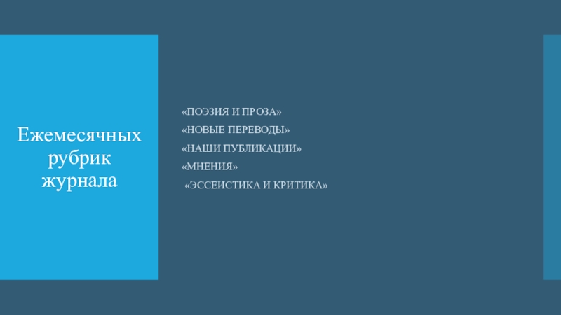 Ежемесячных рубрик журнала«ПОЭЗИЯ И ПРОЗА» «НОВЫЕ ПЕРЕВОДЫ»«НАШИ ПУБЛИКАЦИИ»«МНЕНИЯ» «ЭССЕИСТИКА И КРИТИКА»
