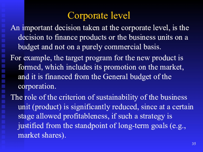 The role of the criterion of sustainability of the business unit (product) is significantly reduced, since at a certain stage allowed profitableness, if such a strategy is justified from the standpoint of long-term goals (e.g., market shares).
