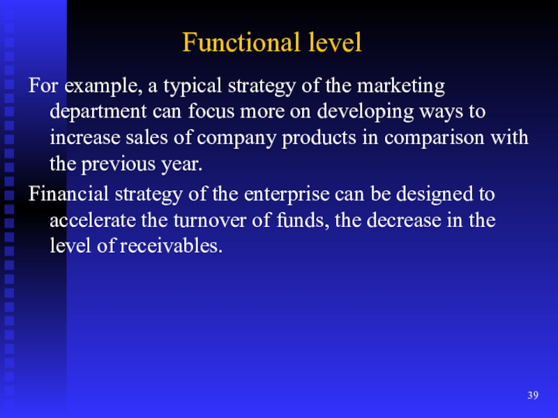 The purpose of the functional strategy is the allocation of resources of the Department (service), the search for effective behavior of functional units within the overall strategy.