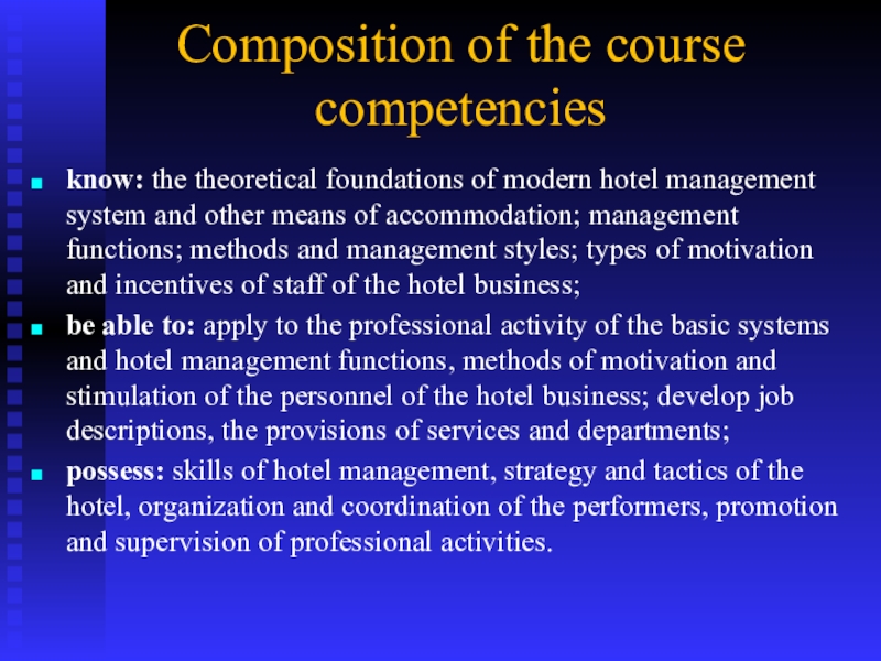 be able to: apply to the professional activity of the basic systems and hotel management functions, methods of motivation and stimulation of the personnel of the hotel business; develop job descriptions, the provisions of services and departments;