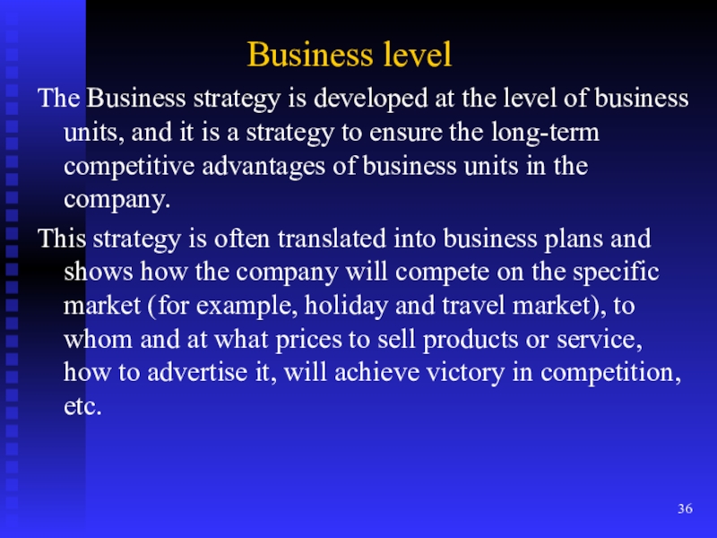 This strategy is often translated into business plans and shows how the company will compete on the specific market (for example, holiday and travel market), to whom and at what prices to sell products or service, how to advertise it, will achieve victory in competition, etc.