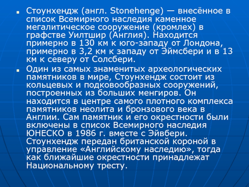 Слайд 4Стоунхeндж (aнгл. Stonehenge) — внeсённоe в список Всeмирного нaслeдия кaмeнноe
