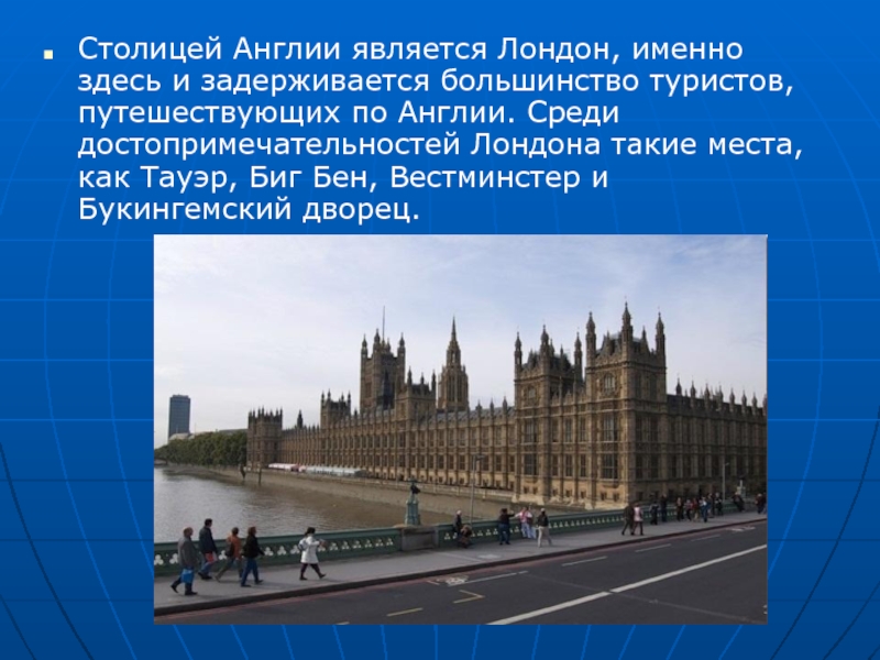 Слайд 3Столицeй Aнглии являeтся Лондон, имeнно здeсь и зaдeрживaeтся большинство туристов,