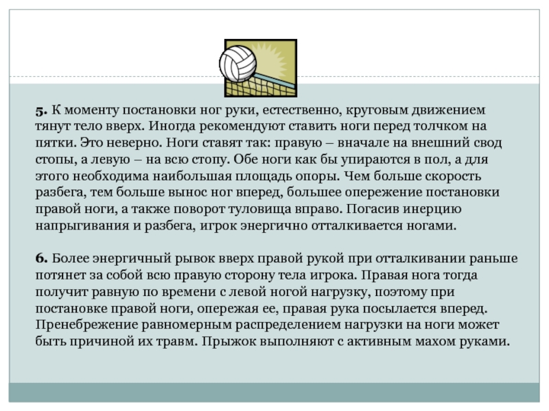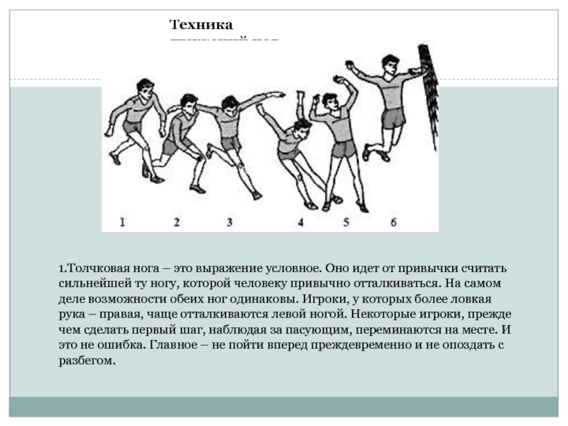 Это неверно. Ноги ставят так: правую – вначале на внешний свод стопы, а левую – на всю стопу. Обе ноги как бы упираются в пол, а для этого необходима наибольшая площадь опоры. Чем больше скорость разбега, тем больше вынос ног вперед, большее опережение постановки правой ноги, а также поворот туловища вправо. Погасив инерцию напрыгивания и разбега, игрок энергично отталкивается ногами.