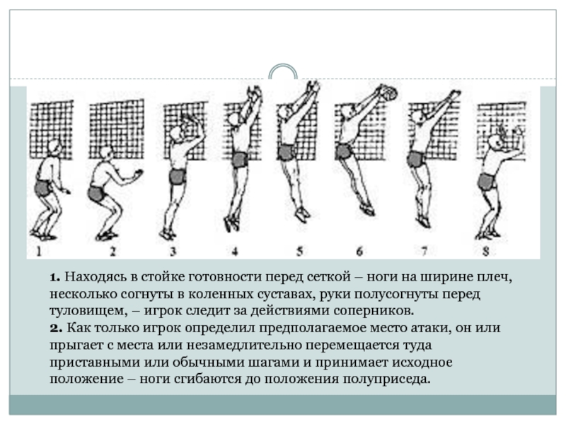 2. Как только игрок определил предполагаемое место атаки, он или прыгает с места или незамедлительно перемещается туда приставными или обычными шагами и принимает исходное положение – ноги сгибаются до положения полуприседа.
