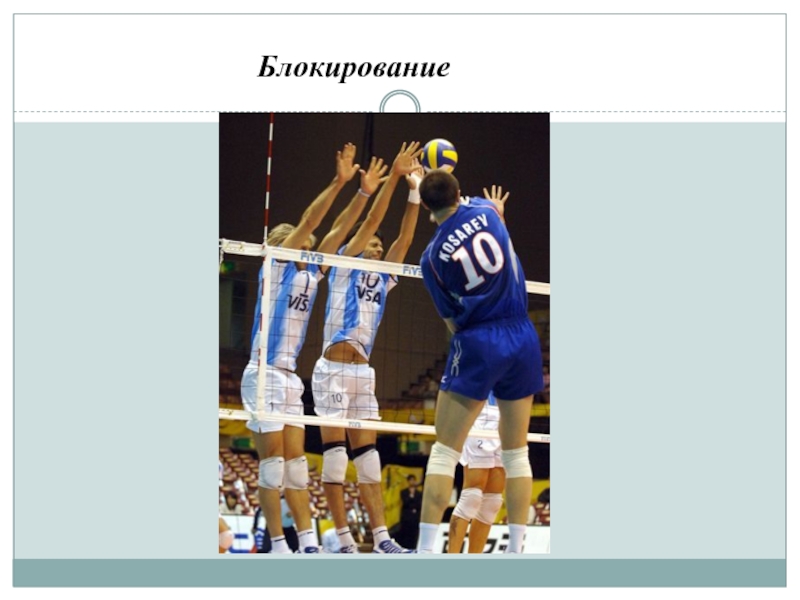 Слайд 155. Блокирующий игрок в прыжке контролирует мяч и одновременно следит