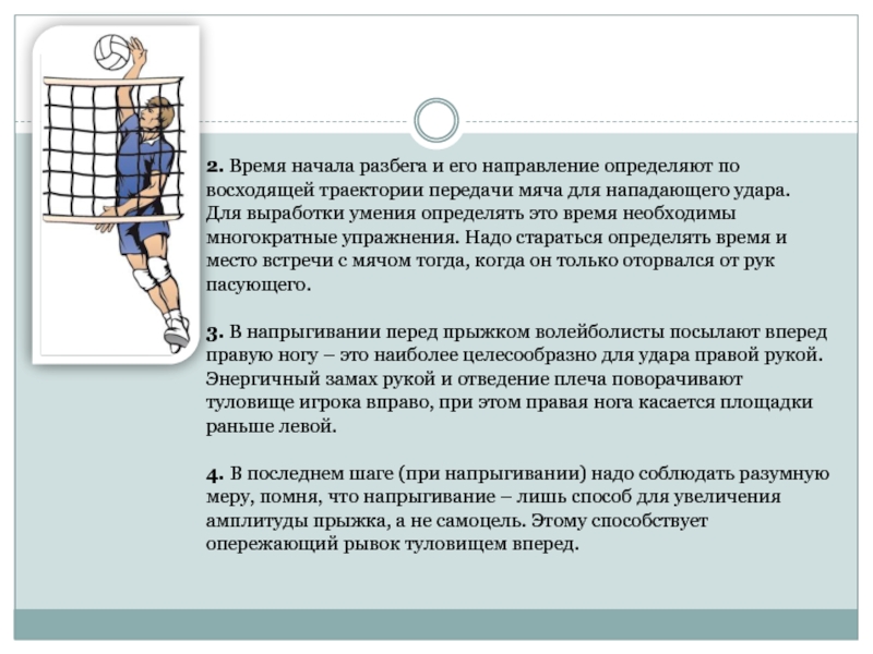 3. В напрыгивании перед прыжком волейболисты посылают вперед правую ногу – это наиболее целесообразно для удара правой рукой. Энергичный замах рукой и отведение плеча поворачивают туловище игрока вправо, при этом правая нога касается площадки раньше левой.