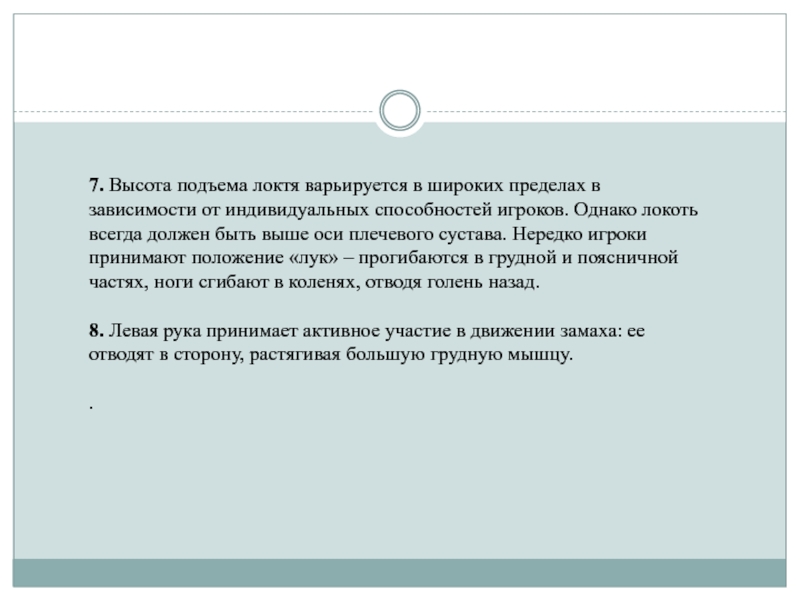 8. Левая рука принимает активное участие в движении замаха: ее отводят в сторону, растягивая большую грудную мышцу.