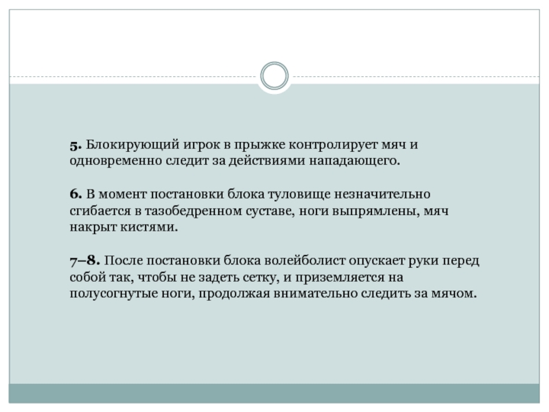 7–8. После постановки блока волейболист опускает руки перед собой так, чтобы не задеть сетку, и приземляется на полусогнутые ноги, продолжая внимательно следить за мячом.