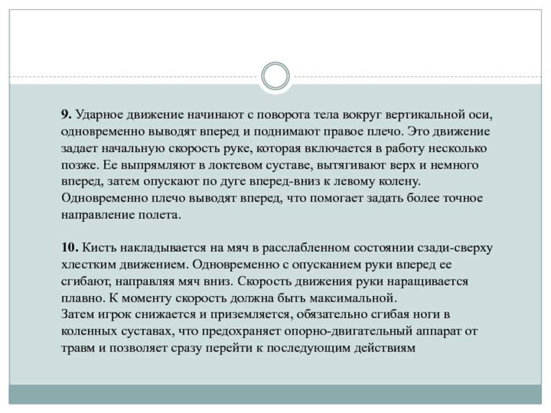 10. Кисть накладывается на мяч в расслабленном состоянии сзади-сверху хлестким движением. Одновременно с опусканием руки вперед ее сгибают, направляя мяч вниз. Скорость движения руки наращивается плавно. К моменту скорость должна быть максимальной.