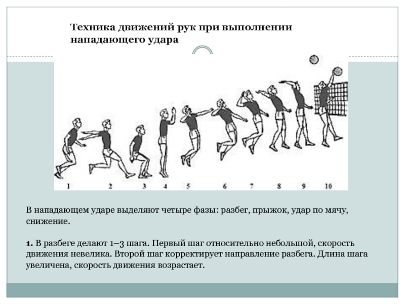 выделяют четыре фазы: разбег, прыжок, удар по мячу, снижение.