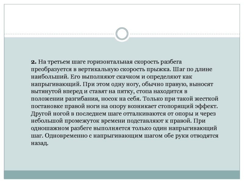 определяют как напрыгивающий. При этом одну ногу, обычно правую, выносят вытянутой вперед и ставят на пятку, стопа находится в положении разгибания, носок на себя. Только при такой жесткой постановке правой ноги на опору возникает стопорящий эффект. Другой ногой в последнем шаге отталкиваются от опоры и через небольшой промежуток времени подставляют к правой. При одношажном разбеге выполняется только один напрыгивающий шаг. Одновременно с напрыгивающим шагом обе руки отводятся назад.