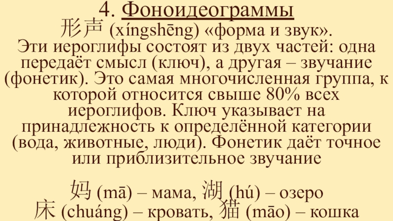 Это самая многочисленная группа, к которой относится свыше 80% всех иероглифов. Ключ указывает на принадлежность к определённой категории (вода, животные, люди). Фонетик даёт точное или приблизительное звучание