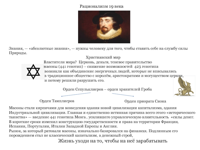 Масоны стали кирпичами для возведения здания новой цивилизации капитализма, здания Индустриальной цивилизации. Главная и единственно истинная причина всего этого «исторического таинства» — введение 441 генотипа Мозга , усилившего управленческую влиятельность «силы денег. В короткие сроки изменил конструкцию государственности и права на территории Франции, Испании, Португалии, Италии Западной Европы и Англии.