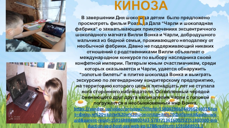 магната Вилли Вонка и Чарли, добродушного мальчика из бедной семьи, проживающего неподалеку от необычной фабрики. Давно не поддерживающий никаких отношений с родственниками Вилли объявляет о международном конкурсе по выбору наследника своей конфетной империи. Пятерым юным счастливчикам, среди которых оказывается и Чарли, удается обнаружить "золотые билеты" в плитке шоколада Вонка и выиграть экскурсию по легендарному кондитерскому предприятию, на территорию которого целых пятнадцать лет не ступала нога стороннего наблюдателя. Ослепленный чередой сменяющего друг друга великолепия Чарли с головой погружается в необыкновенный мир Вонка. https://yandex.ua/video/preview/?filmId=15804296684496624601&text=фильм%20чарли%20и%20шоколадная%20фабрика&path=wizard&parent-reqid=1591688848802493-578771361600252751800300-production-app-host-sas-web-yp-178&redircnt=1591688922.1