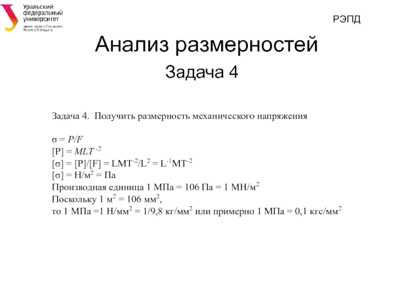 ![1. Анализ размерностей Анализ размерностейЗадача 4 РЭПДЗадача 4. Получить размерность механического напряженияs = P/F[P] Анализ размерностейЗадача 4 РЭПДЗадача 4. Получить размерность механического напряженияs = P/F[P] = MLT -2[s] = [P]/[F] =](/img/tmb/3/259754/3f4e5675a00839bc428e28d62b77f68f-800x.jpg)
