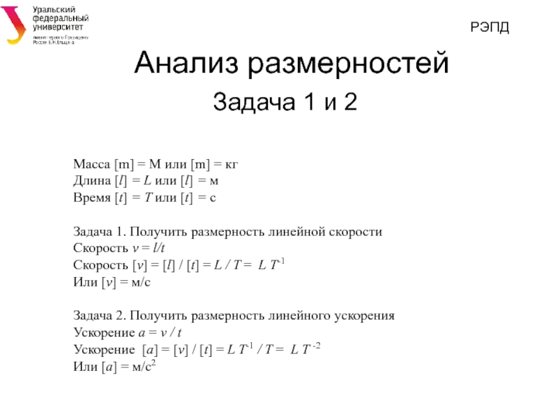 ![1. Анализ размерностей Анализ размерностейЗадача 1 и 2РЭПДМасса [m] = M или [m] = Анализ размерностейЗадача 1 и 2РЭПДМасса [m] = M или [m] = кгДлина [l] = L или [l]](/img/tmb/3/259754/cfe31d0bd4912fe8a9f64d560bb4c1d4-800x.jpg)