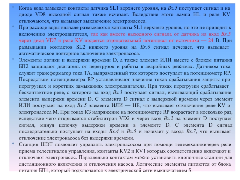 При замыкании контактов SL2 на Вх.6 подается отрицательный потенциал, вследствие чего на диоде VD9 выходной сигнал исчезает, а на диоде VD8 выходной сигнал есть, благодаря чему насос не отключается.