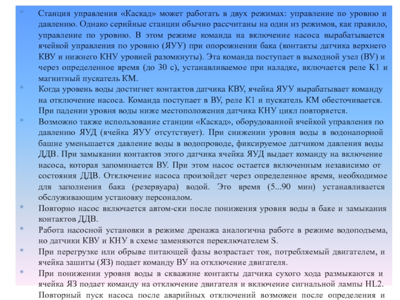 Слайд 6Станция управления «Каскад» может работать в двух режимах: управление по