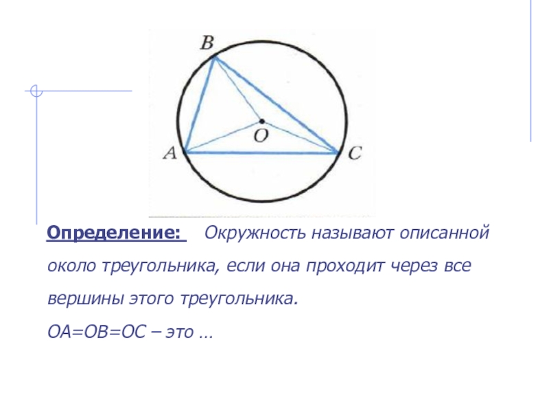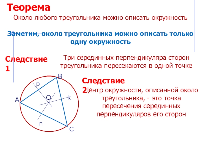 Центр окружности, описанной около треугольника, - это точка пересечения серединных перпендикуляров его сторон