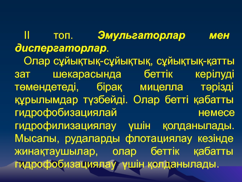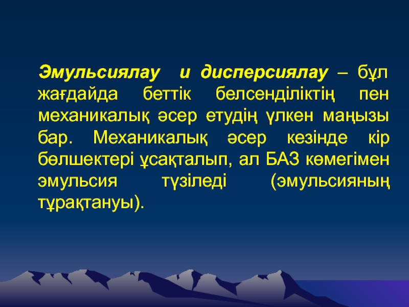 Слайд 16Эмульсиялау и дисперсиялау – бұл жағдайда беттік белсенділіктің пен механикалық