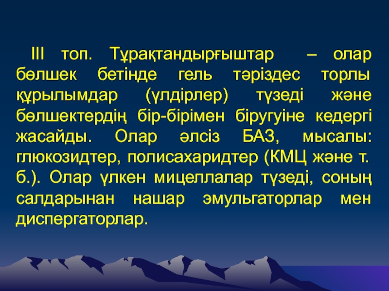 Слайд 20III топ. Тұрақтандырғыштар – олар бөлшек бетінде гель тәріздес торлы