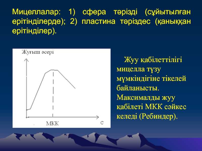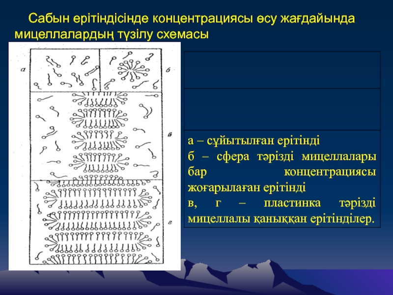 Слайд 9Мицеллалар: 1) сфера тәрізді (сұйытылған ерітінділерде); 2) пластина тәріздес (қаныққан