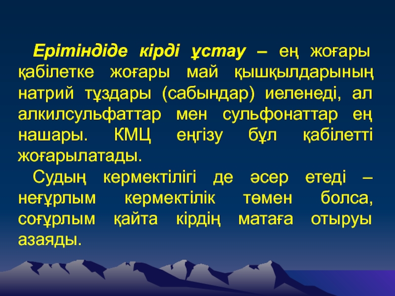 Слайд 17Ерітіндіде кірді ұстау – ең жоғары қабілетке жоғары май қышқылдарының