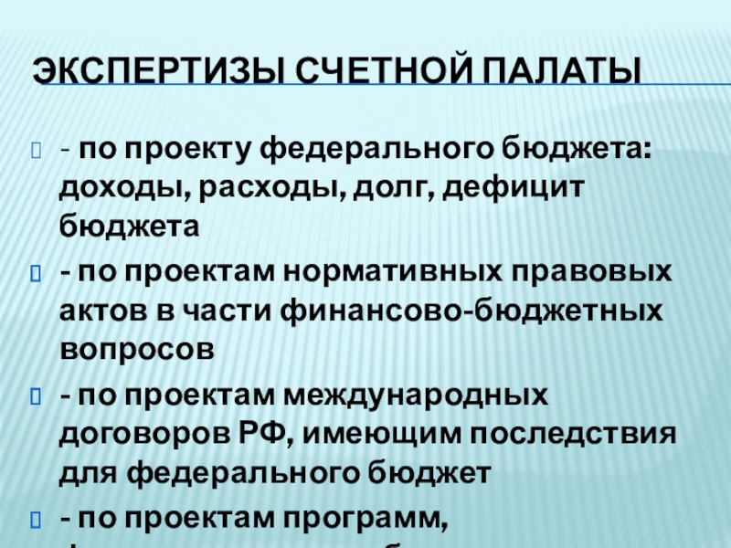 Экспертизы счетной палаты- по проекту федерального бюджета: доходы, расходы, долг, дефицит бюджета- по проектам нормативных правовых актов
