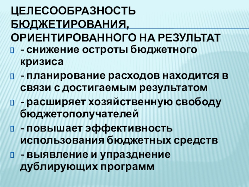 Целесообразность бюджетирования, ориентированного на результат- снижение остроты бюджетного кризиса- планирование расходов находится в связи с достигаемым результатом-