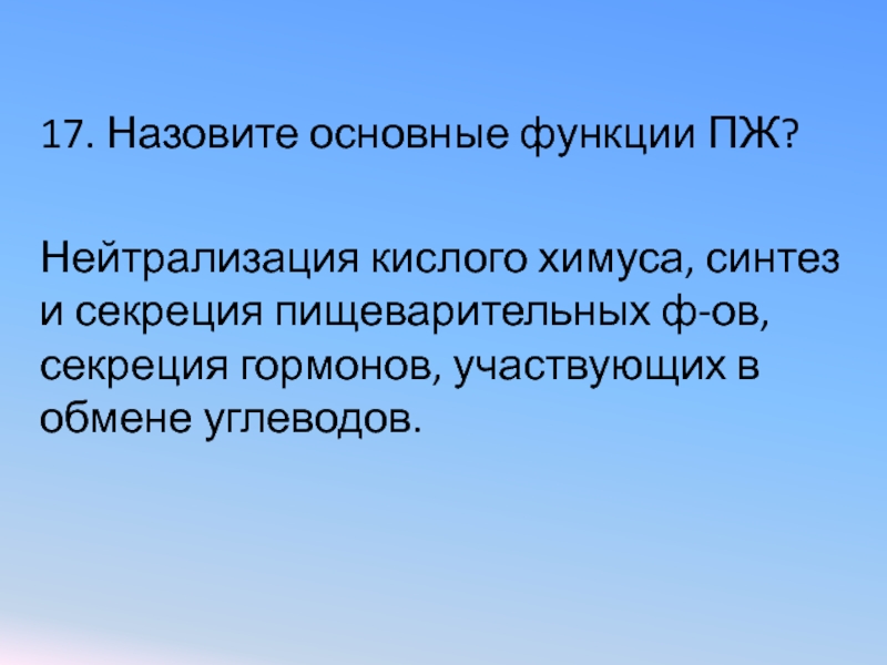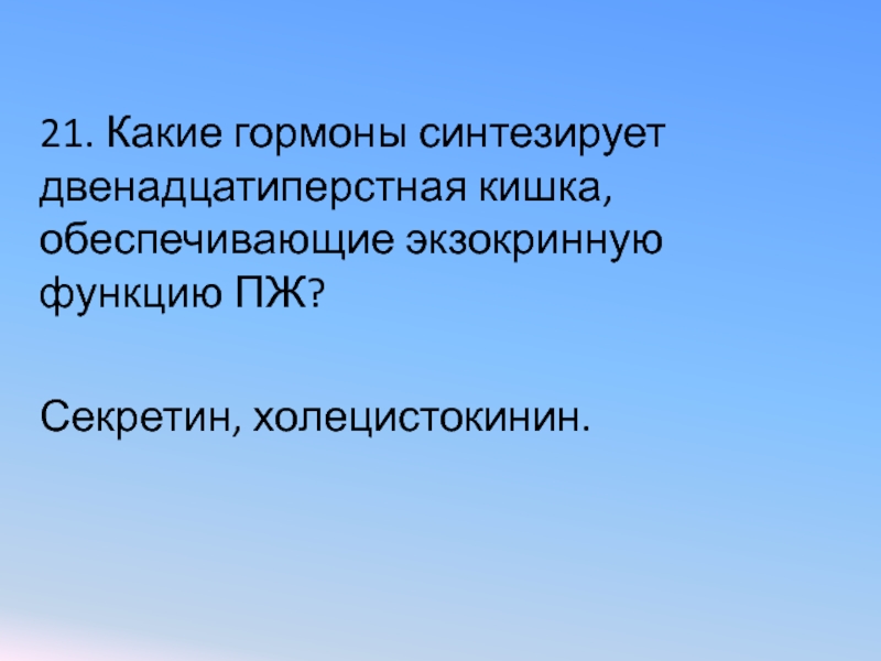 Слайд 2121. Какие гормоны синтезирует двенадцатиперстная кишка, обеспечивающие экзокринную функцию ПЖ?