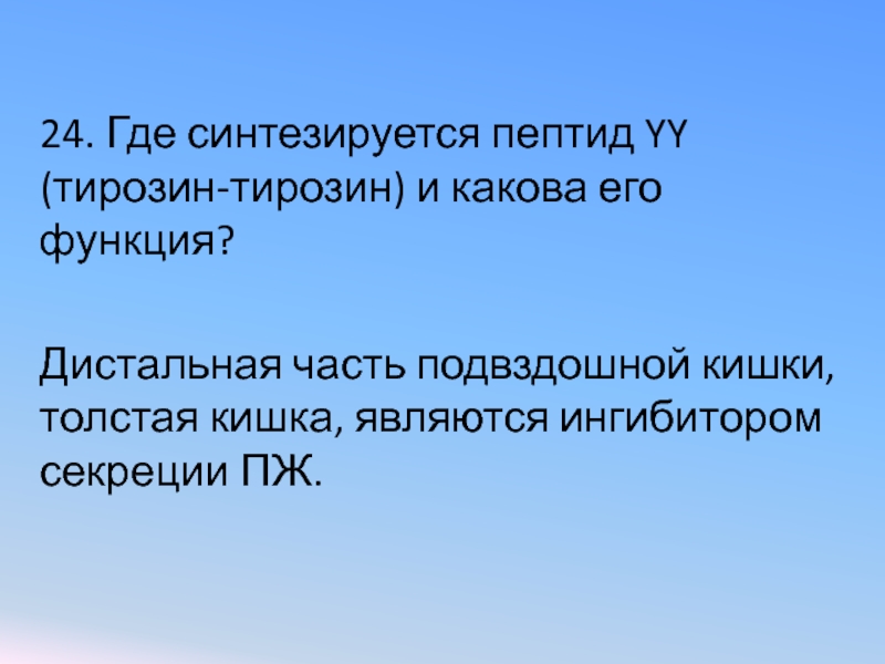 Слайд 2424. Где синтезируется пептид YY (тирозин-тирозин) и какова его функция?