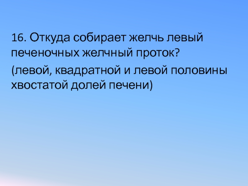 Слайд 1616. Откуда собирает желчь левый печеночных желчный проток?
