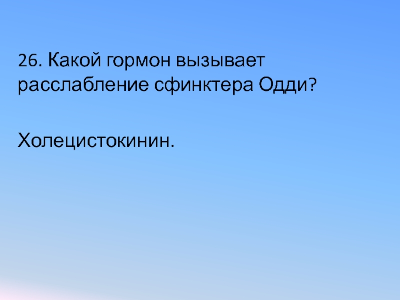 Слайд 2626. Какой гормон вызывает расслабление сфинктера Одди?