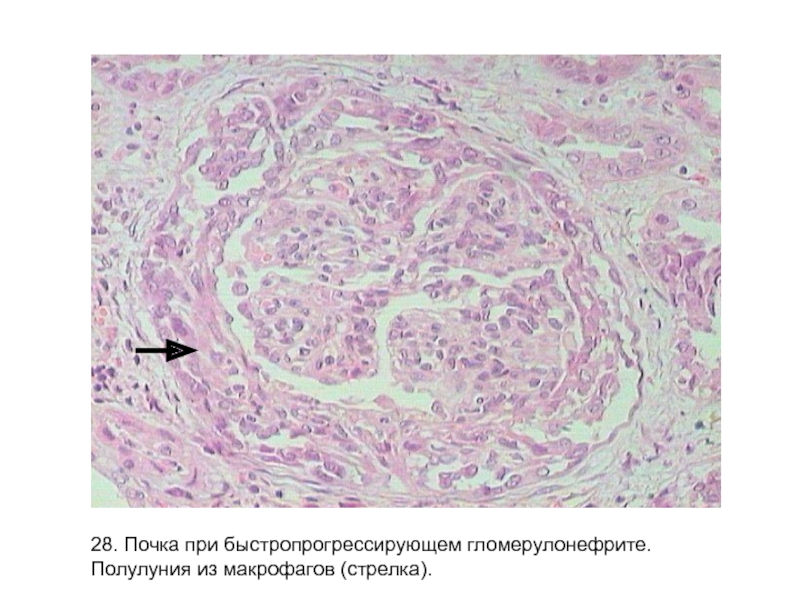 28. Почка при быстропрогрессирующем гломерулонефрите.Полулуния из макрофагов (стрелка).