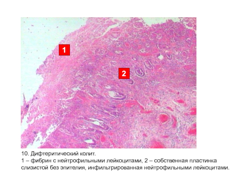 10. Дифтеритический колит.1 – фибрин с нейтрофильными лейкоцитами, 2 – собственная пластинкаслизистой без эпителия, инфильтрированная нейтрофильными лейкоцитами.12