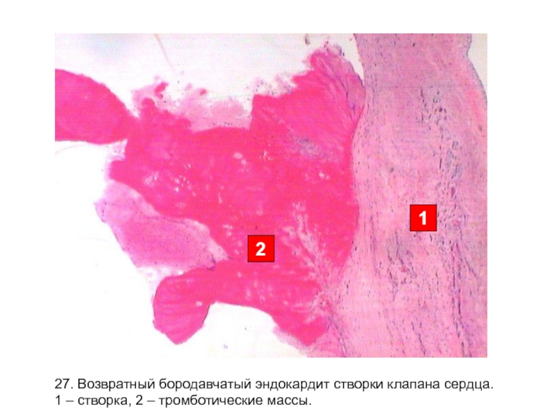 Слайд 3127. Возвратный бородавчатый эндокардит створки клапана сердца.