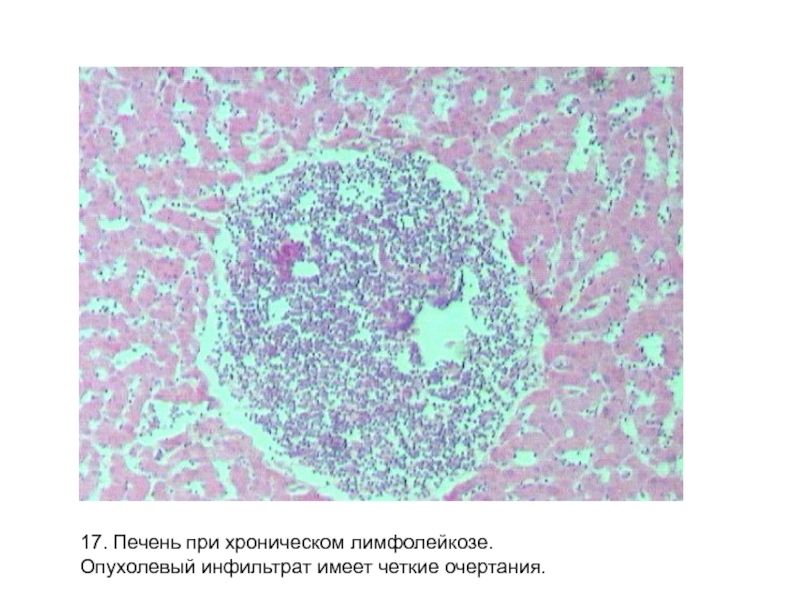 17. Печень при хроническом лимфолейкозе.Опухолевый инфильтрат имеет четкие очертания.
