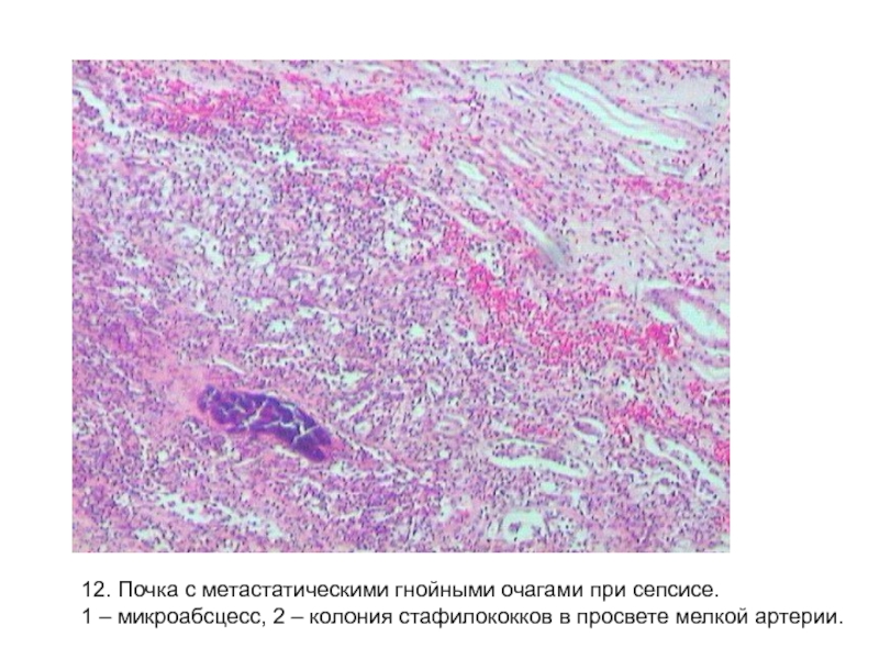 12. Почка с метастатическими гнойными очагами при сепсисе.1 – микроабсцесс, 2 – колония стафилококков в просвете мелкой