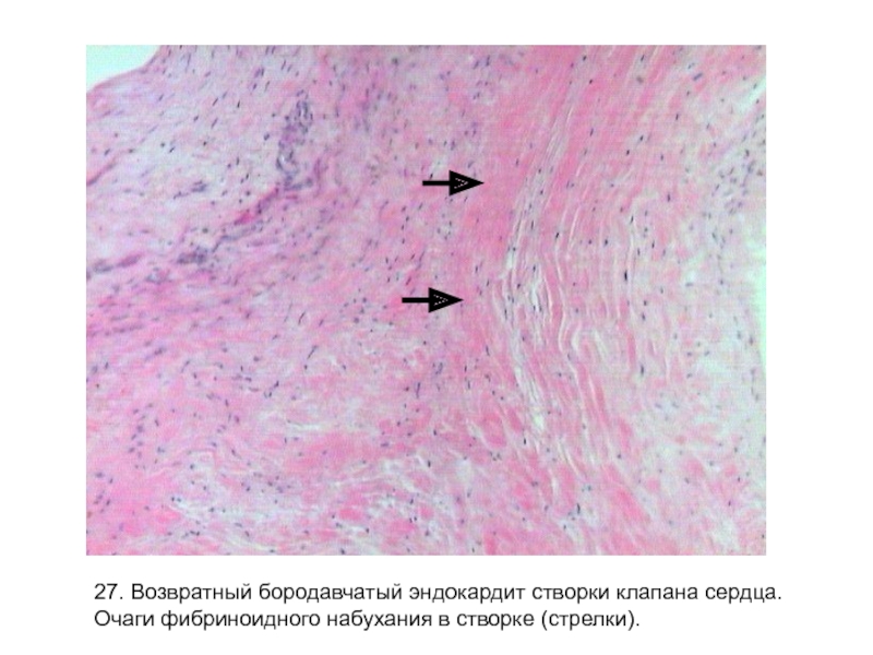 27. Возвратный бородавчатый эндокардит створки клапана сердца.Очаги фибриноидного набухания в створке (стрелки).