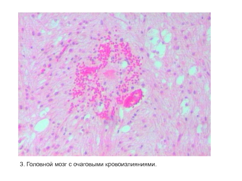 Слайд 33. Головной мозг с очаговыми кровоизлияниями.