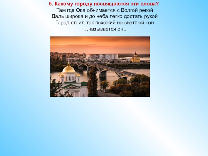 5. Какому городу посвящаются эти слова?  Там где Ока обнимается с Волгой рекой  Даль широка