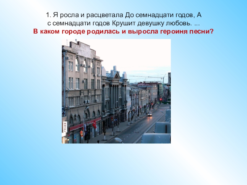 1. Я росла и расцветала До семнадцати годов, А с семнадцати годов Крушит девушку любовь. ... В каком городе родилась и выросла героиня песни?
