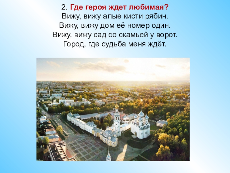 2. Где героя ждет любимая? Вижу, вижу алые кисти рябин. Вижу, вижу дом её номер один. Вижу, вижу сад