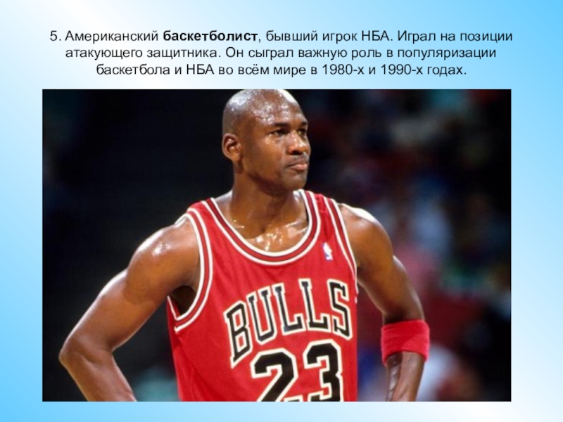 5. Американский баскетболист, бывший игрок НБА. Играл на позиции атакующего защитника. Он сыграл важную роль в популяризации