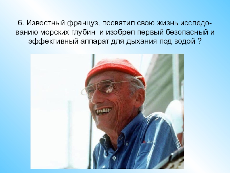 Слайд 316. Известный француз, посвятил свою жизнь исследо- ванию морских глубин